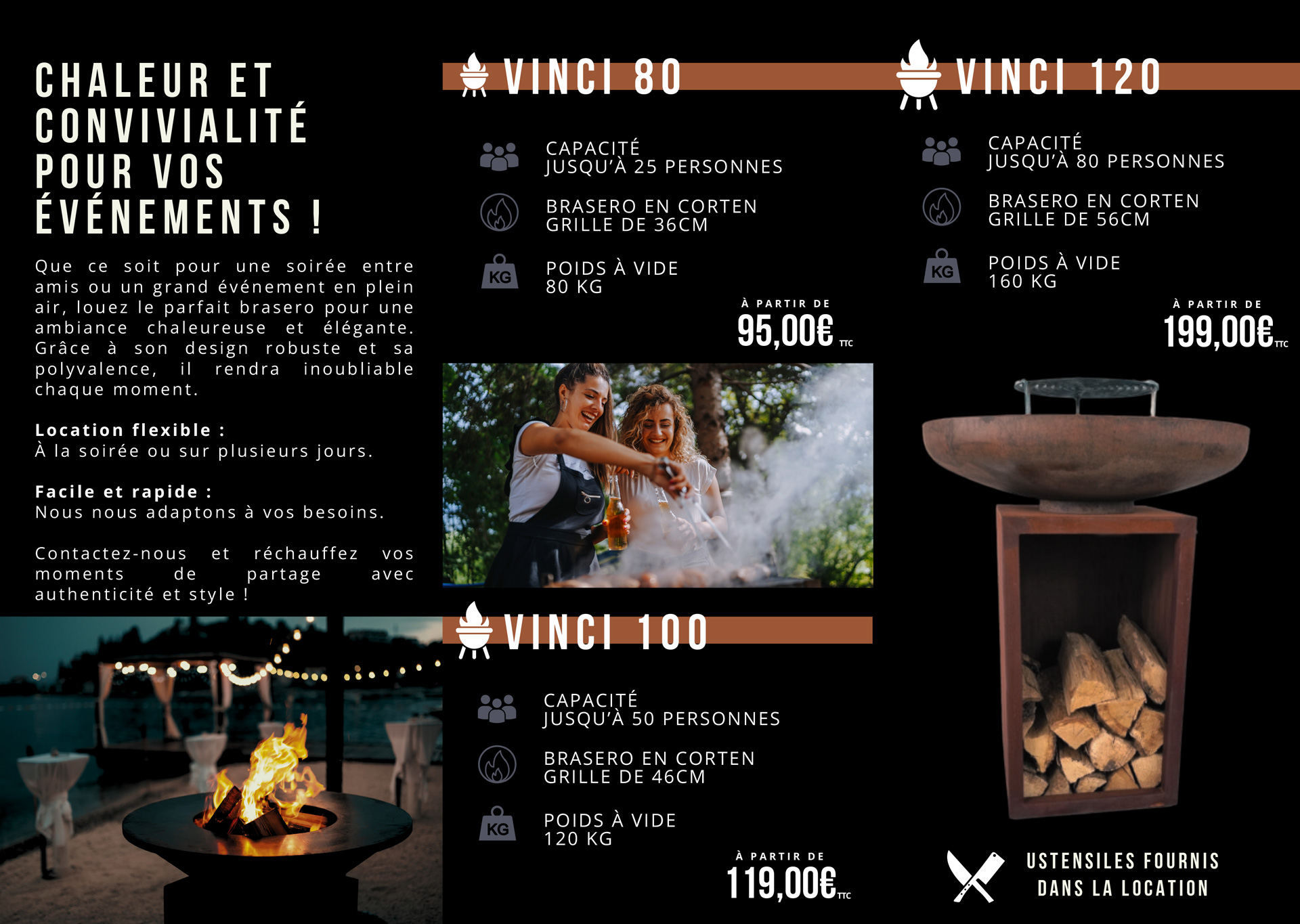 Que ce soit pour une soirée entre amis ou un grand événement en plein air, louez un brasero d’exception pour créer une ambiance à la fois élégante et chaleureuse.